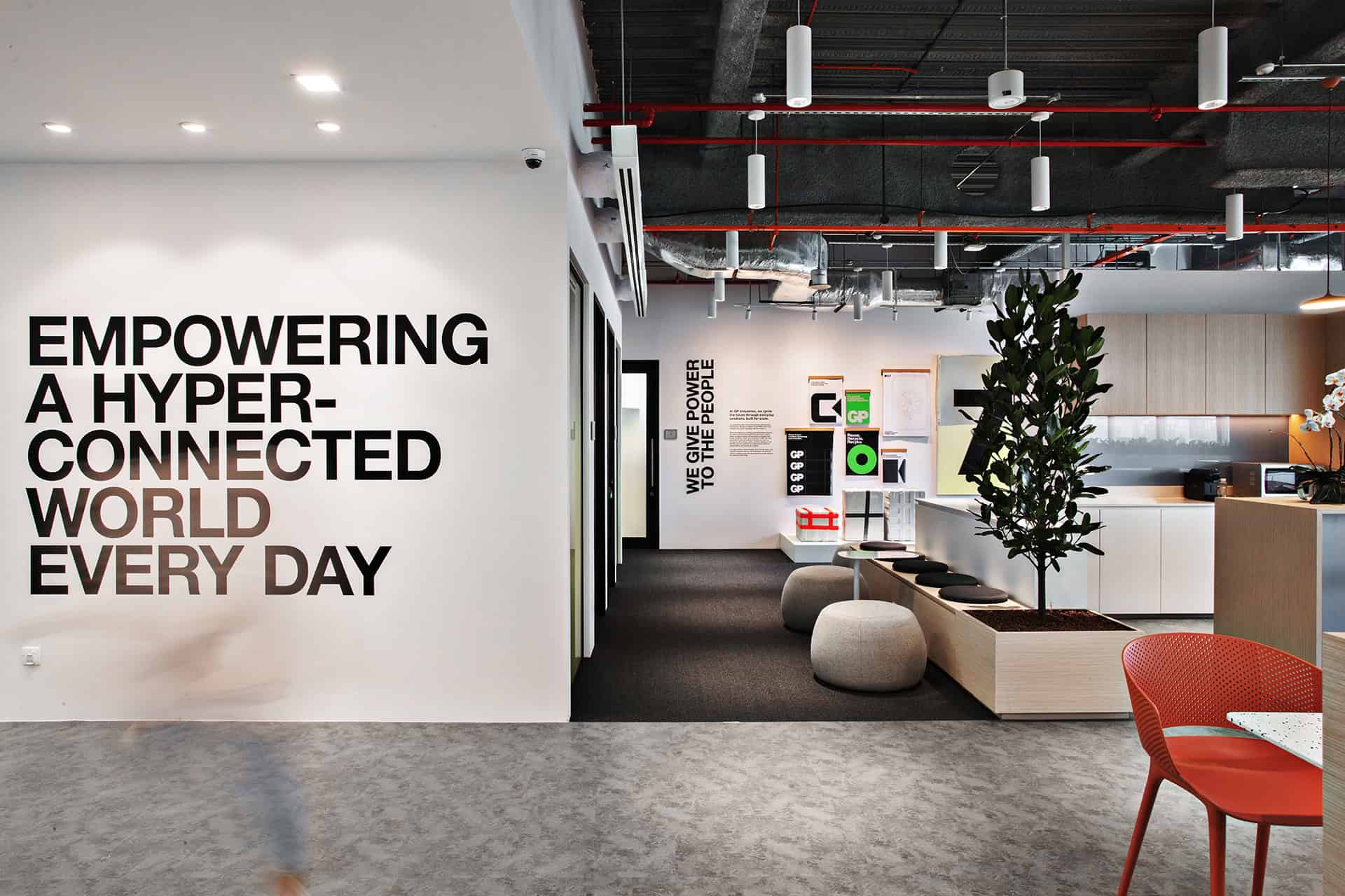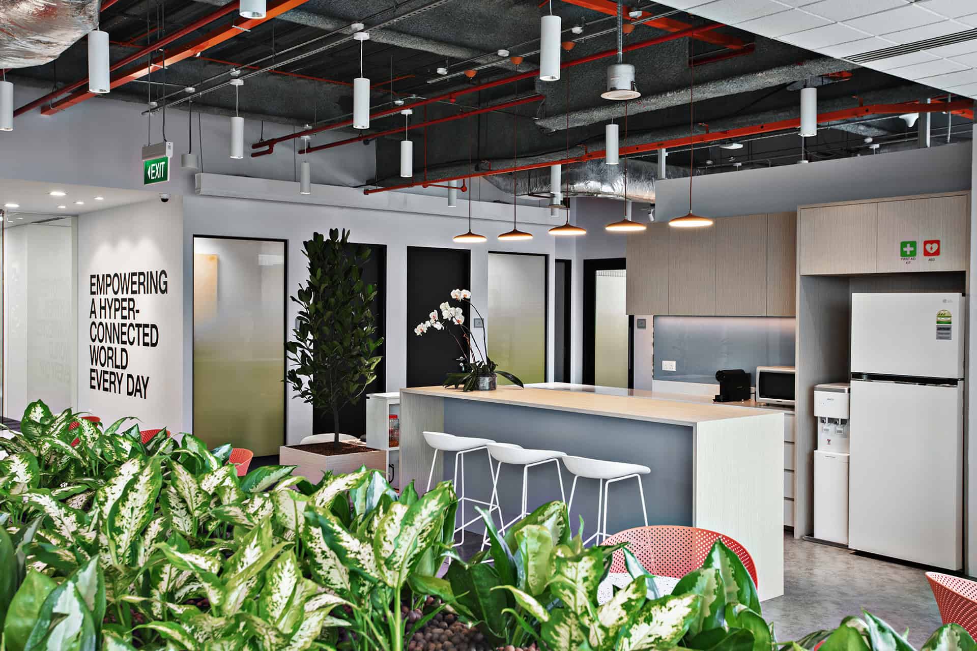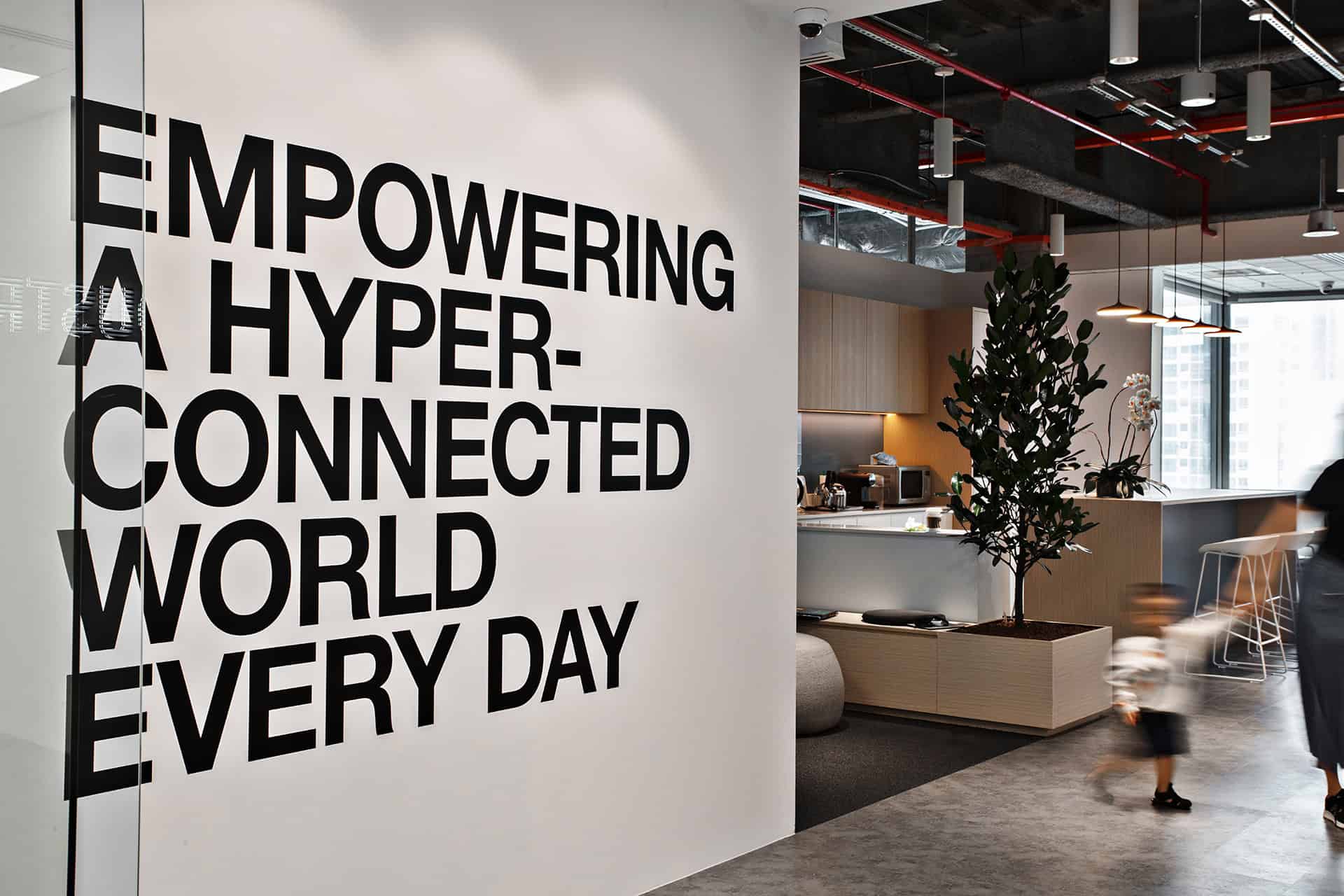 to auditorium. Durable yet tactile materials pair with greenery to soften the tech edge, while an activity- based layout keeps the space dynamic, adaptable, and ready for teams on the move.”