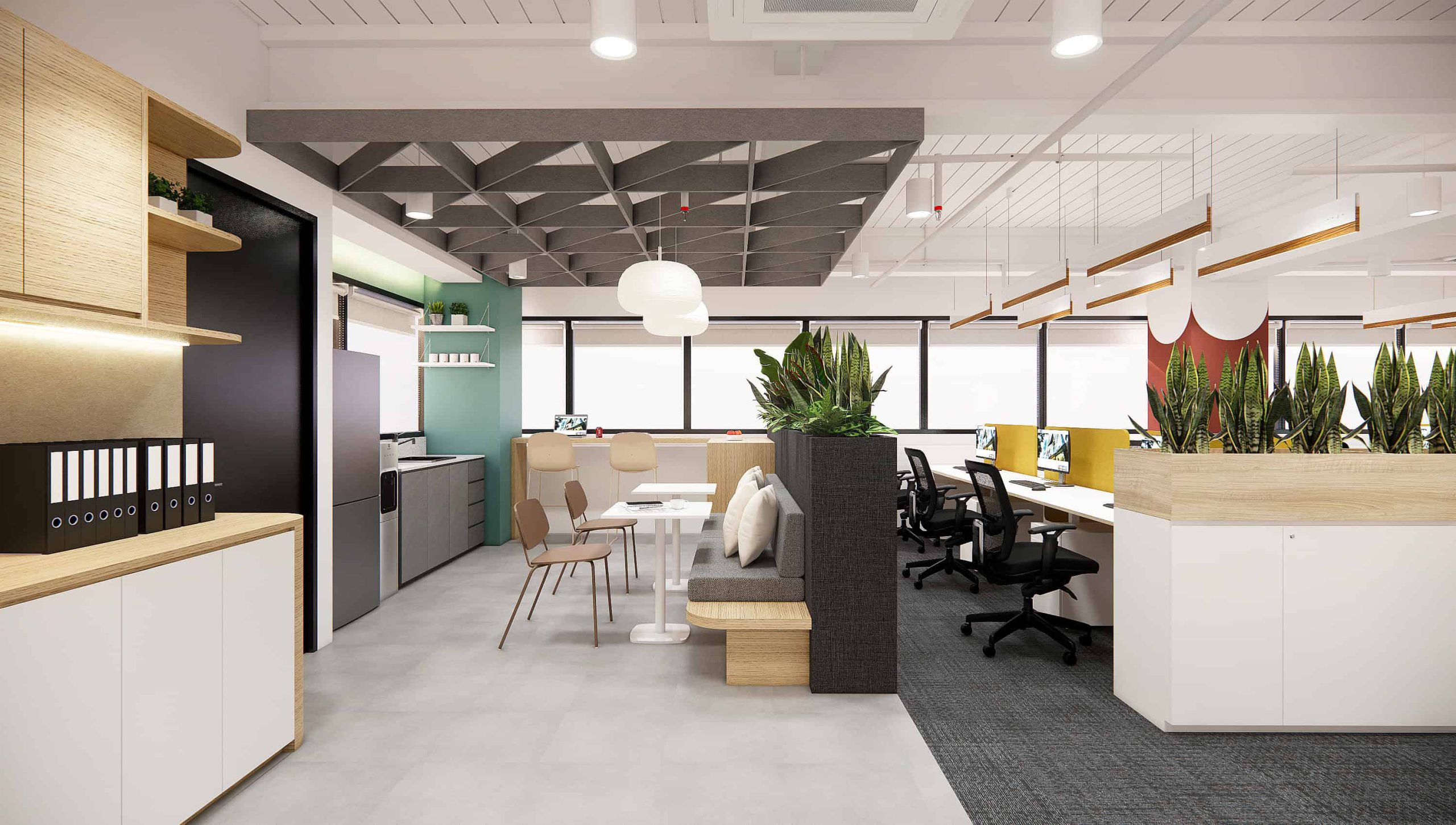 pantry/collab zone flexes to host town halls and workshops with modular furniture, mobile AV, and programmable lighting,shifting effortlessly from café